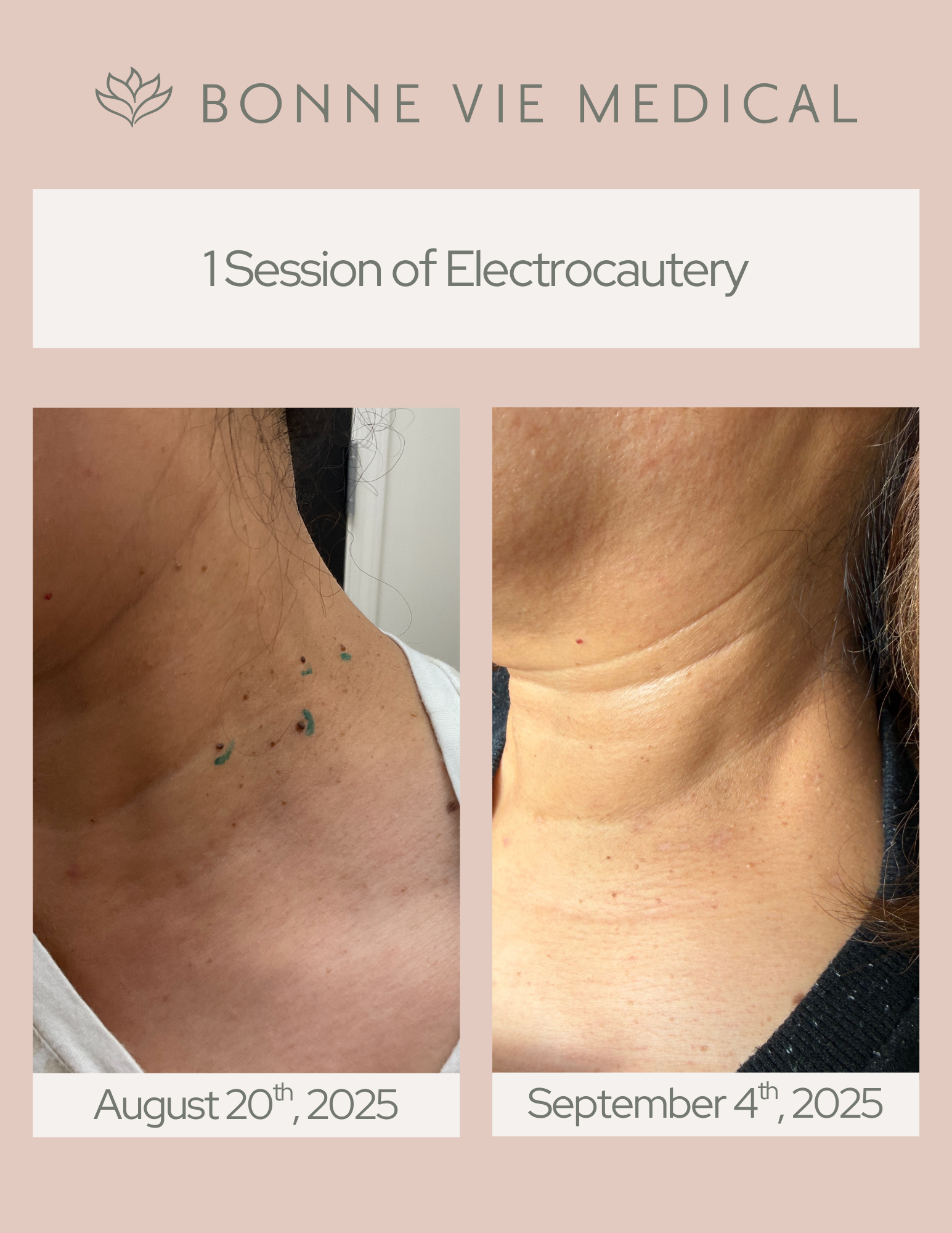 Most people feel brief warmth or a light sting when undergoing Electrocautery; we typically use local anesthetic (topical or a small injection) to keep you comfortable. You may notice a faint smell as tissue is cauterized—that’s normal. After treatment, the area can be red with a small crust or scab for 5–10 days (face) or up to 2–3 weeks (body). Temporary darkening or lightening of skin can occur, especially on darker skin tones; strict sun protection helps minimize this.